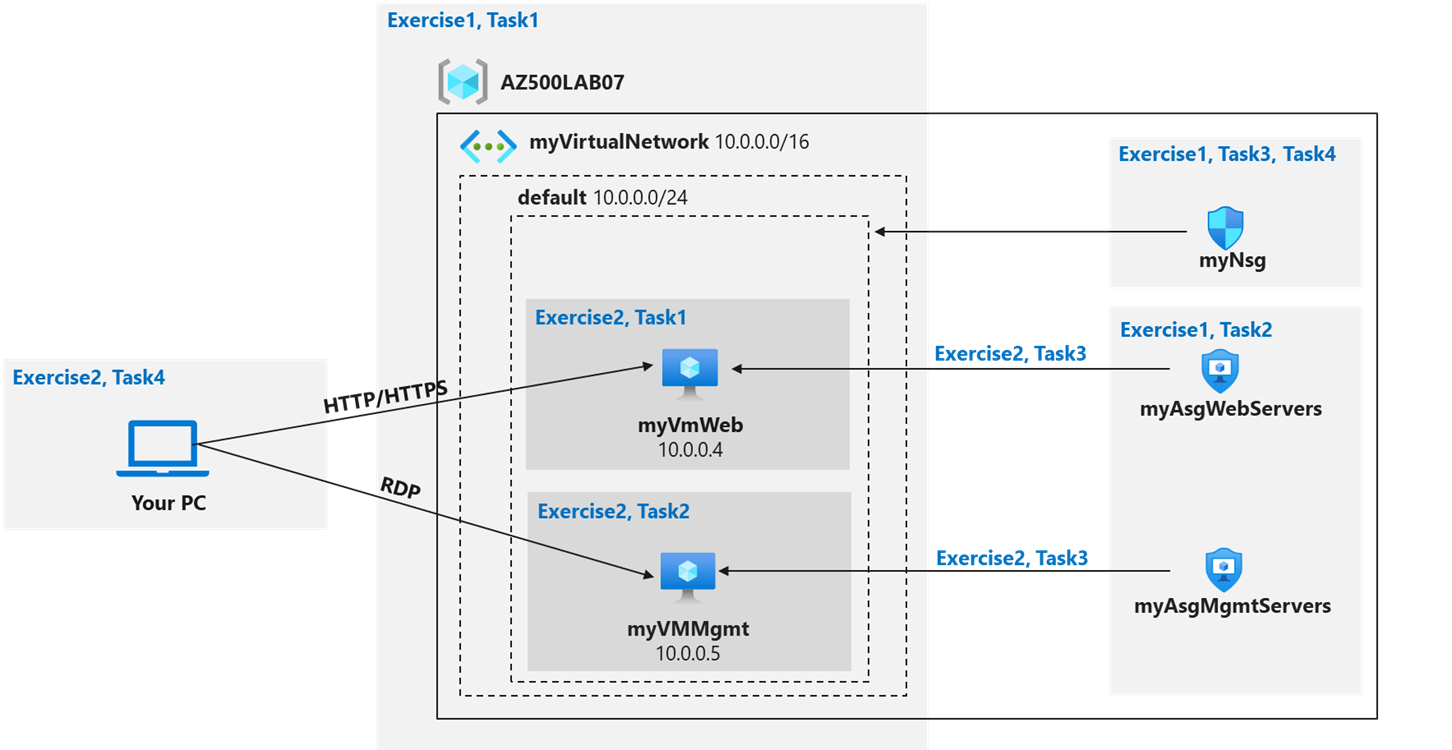 Result: You have deployed a virtual network, network security with inbound security rules, and two application security groups.