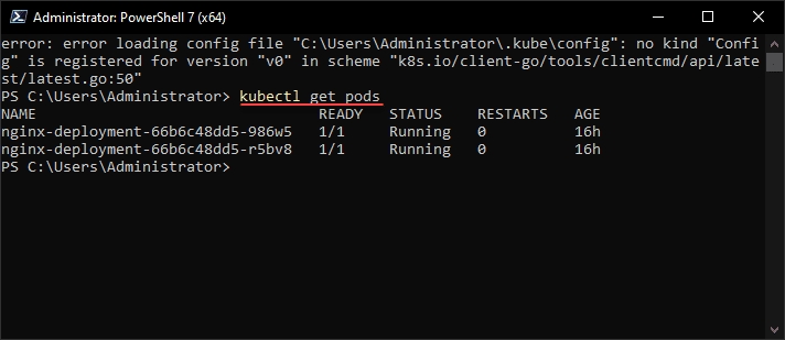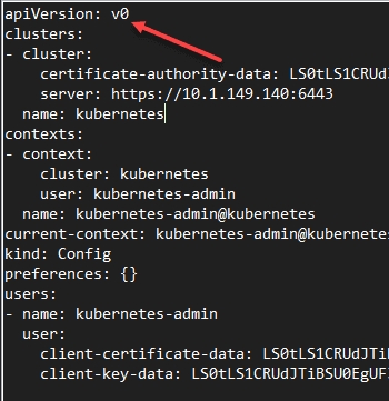 The last step is verifying connectivity to the Kubernetes cluster. After changing the API version in the kubeconfig file to v1, as you can see below, after getting the error we can now connect to the Kubernetes cluster and get pods.