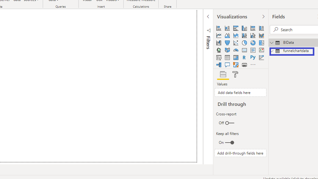 You have loaded the Excel file in the canvas, and the Fields pane contains the variables of the data. This is a fictitious data set of bank loan disbursal across years. You can download the dataset here.