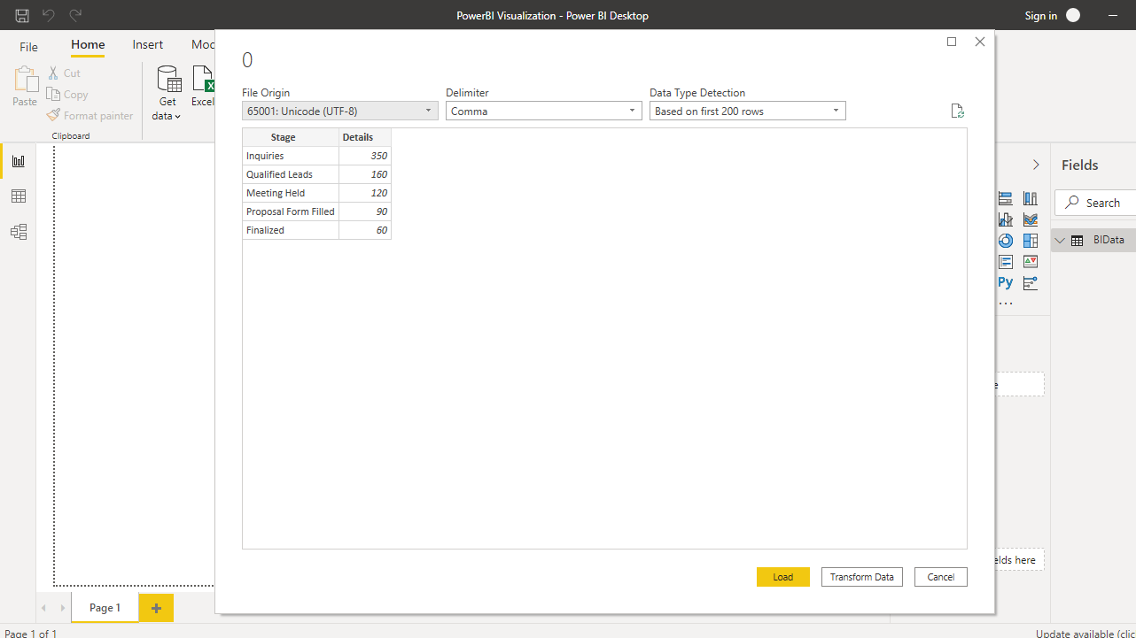 Browse to the location of the file and select it. The preview of the data is shown, and once you are satisfied that you are loading the right file, click Load. The file name is funnelchartdata, which is a fictitious sales conversion data. You can download the dataset