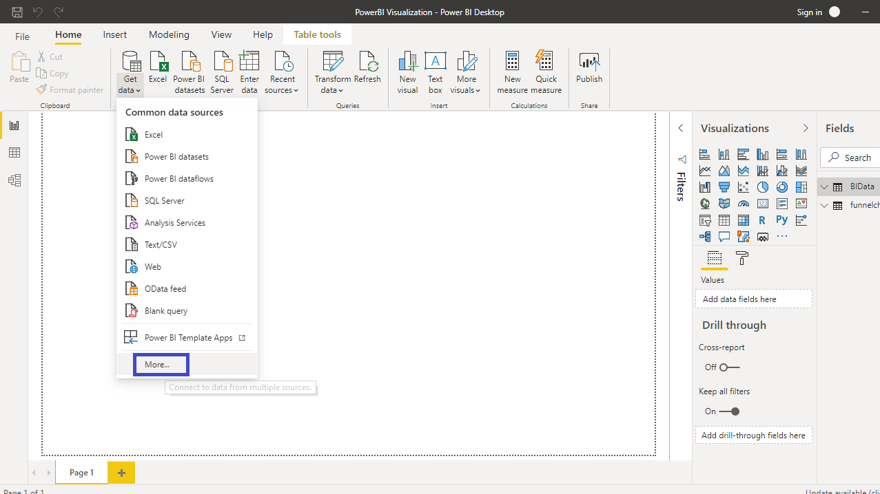 Apart from the common options to get data in Power BI Desktop, there are a variety of other options also available in Power BI. To view these options, click on Get data option and select More from the options.