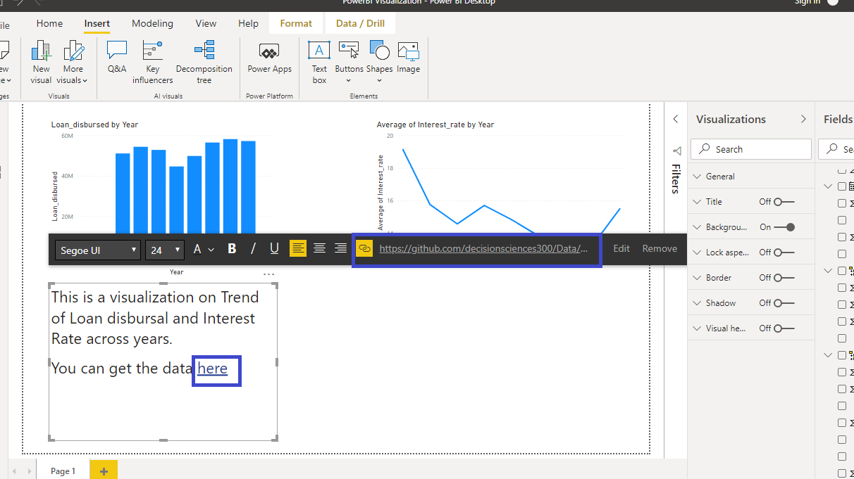 Click on the text box in the canvas and you can add the relevant text in the box. In this case, you will add This is a visualization on Trend of Loan disbursal and Interest Rate across years. You can set the font size to 24.