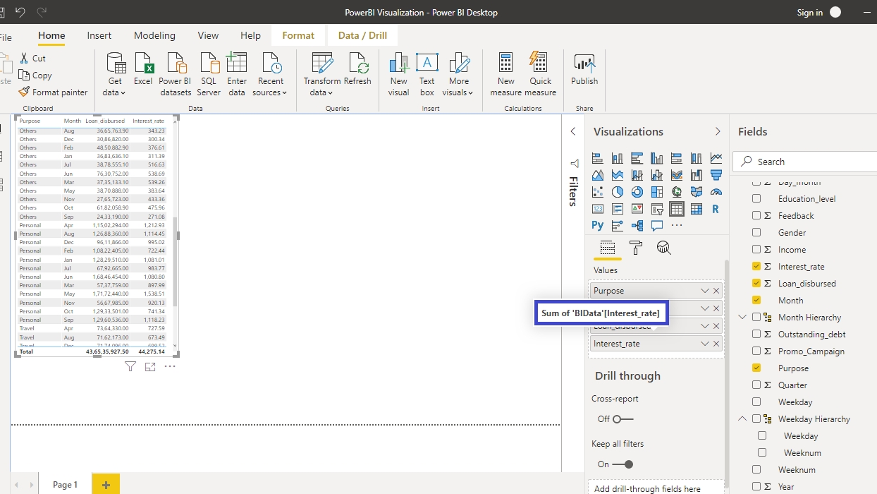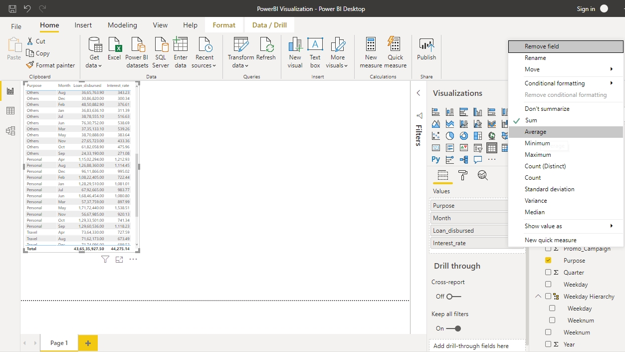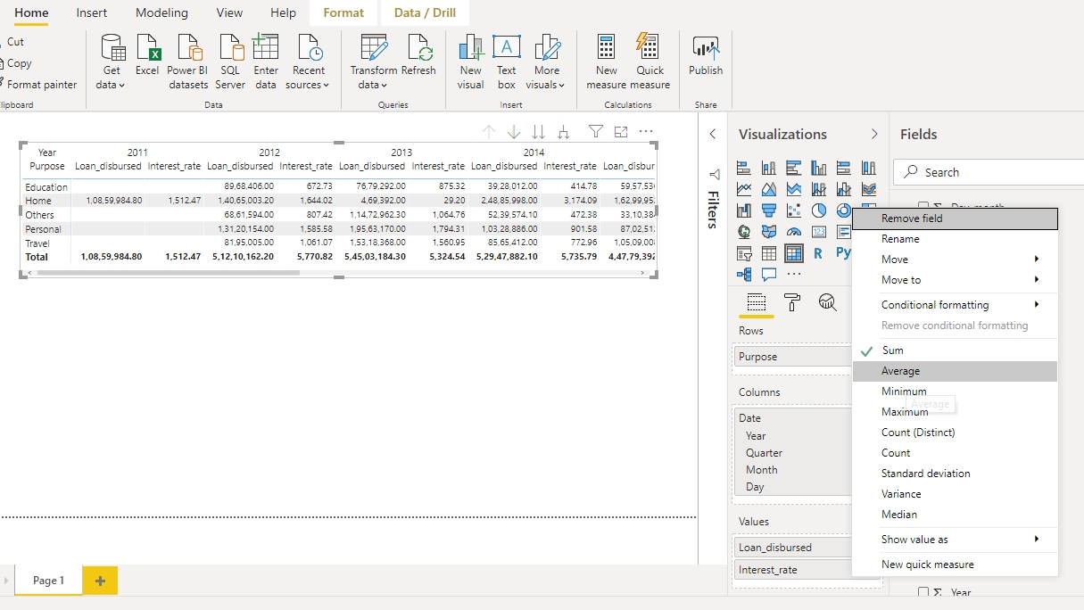 is displayed. This is because the default aggregation type is the sum. This is incorrect as you are interested in the average interest rate and not the sum of rates.