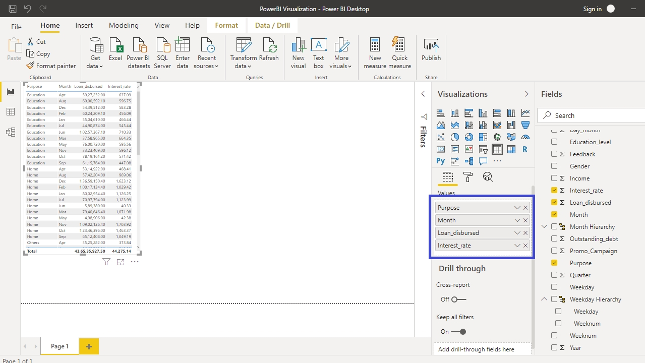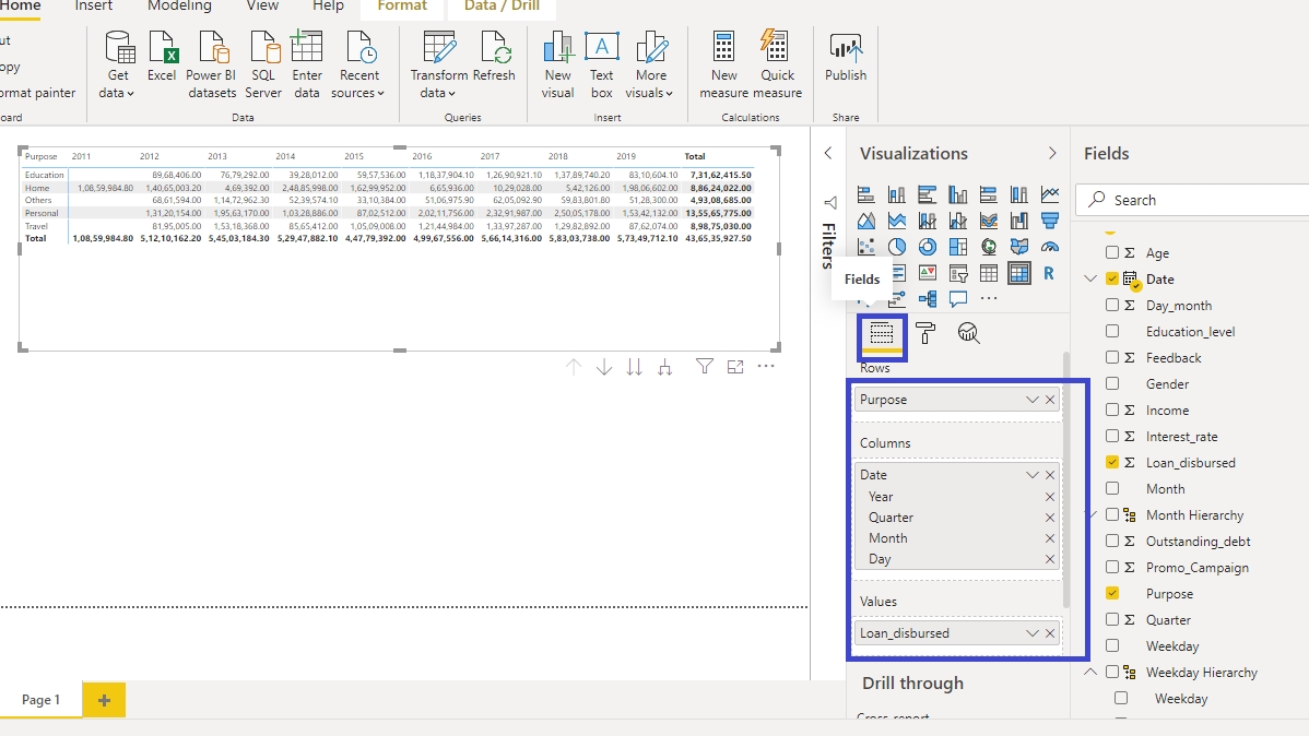 hierarchy of your choice. For this guide, keep it at the Year level. For Values, drag the Loan_disbursed