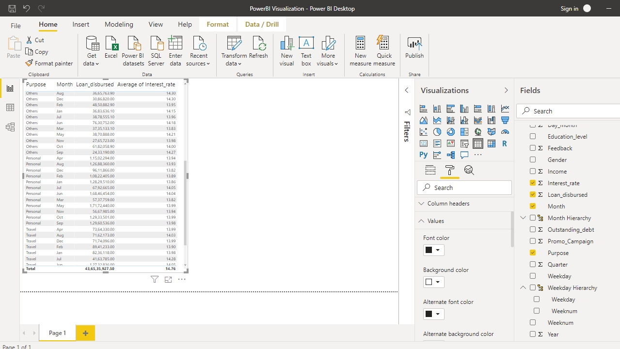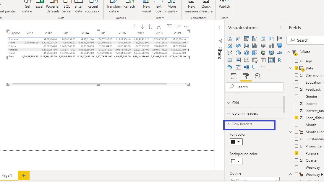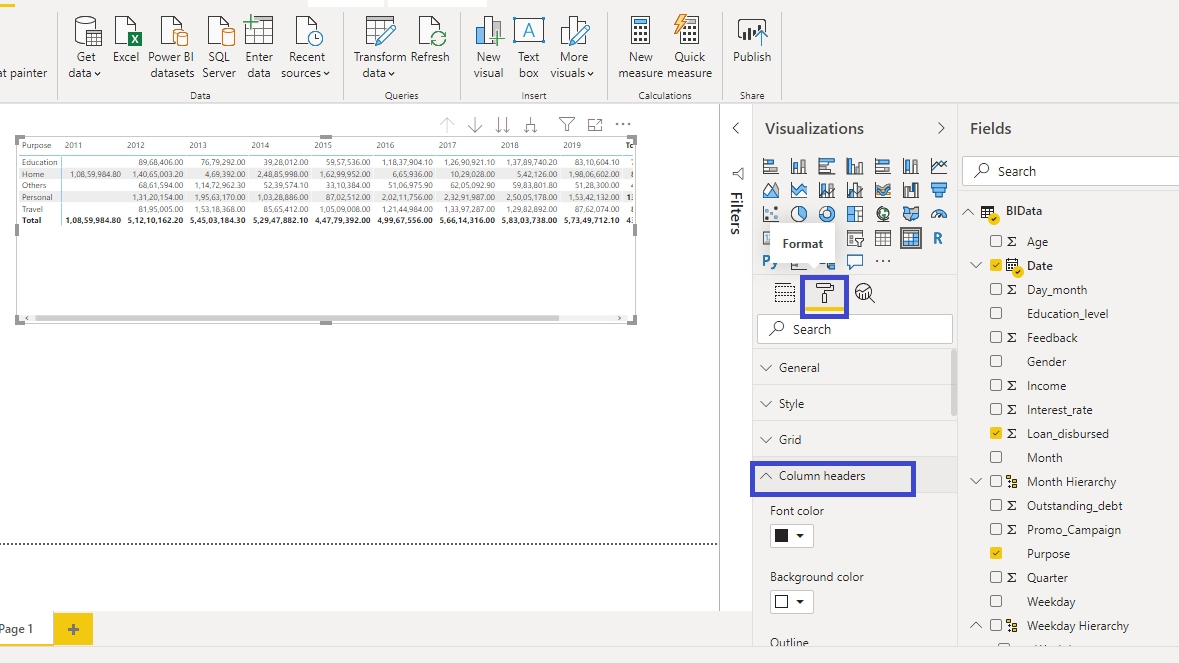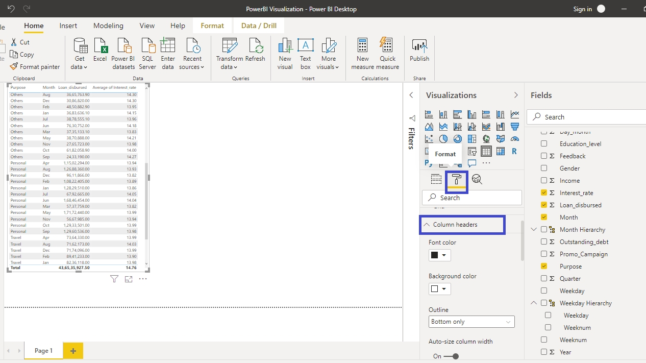 The above table is ready, but it requires formatting. There are several formatting options in PowerBI, and you can explore some of these. Start with the Column headers under the Format pane.