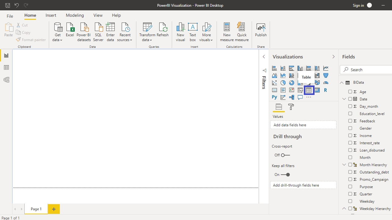 You have loaded the file, and you can save the dashboard. It is named PowerBI Visualization. The Fields pane contains the variables of the data.