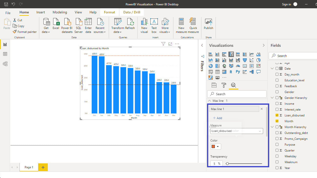 The output above shows the Loan_disbursed by Month chart. You can perform some formatting options. For example, you can turn on the Data labels option as shown below.