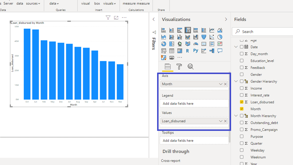 You can resize the chart on the canvas. The next step is to fill the visualization arguments under the Fields option as shown below. Drag the variable Month into the Axis field, and Loan_disbursed in the Values field.