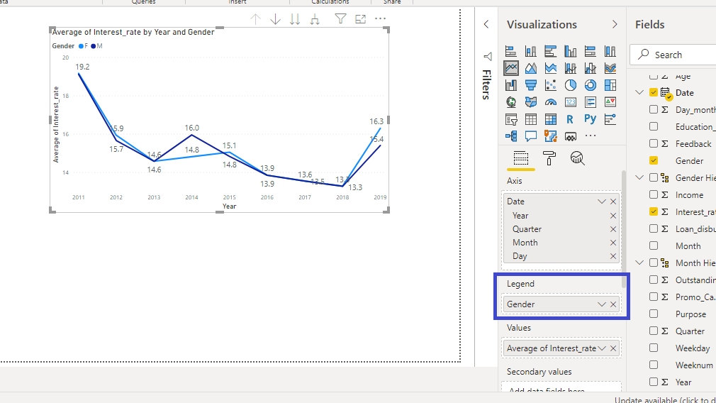 You can also add new dimensions to the chart. For example, drag the Gender variable into the Legend option. This creates two line charts corresponding to gender.
