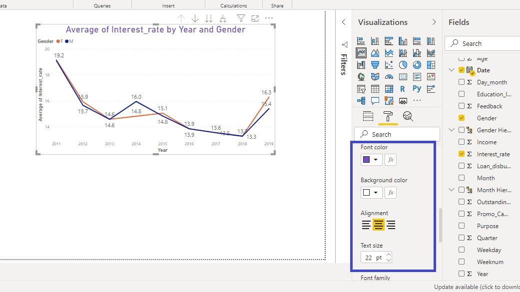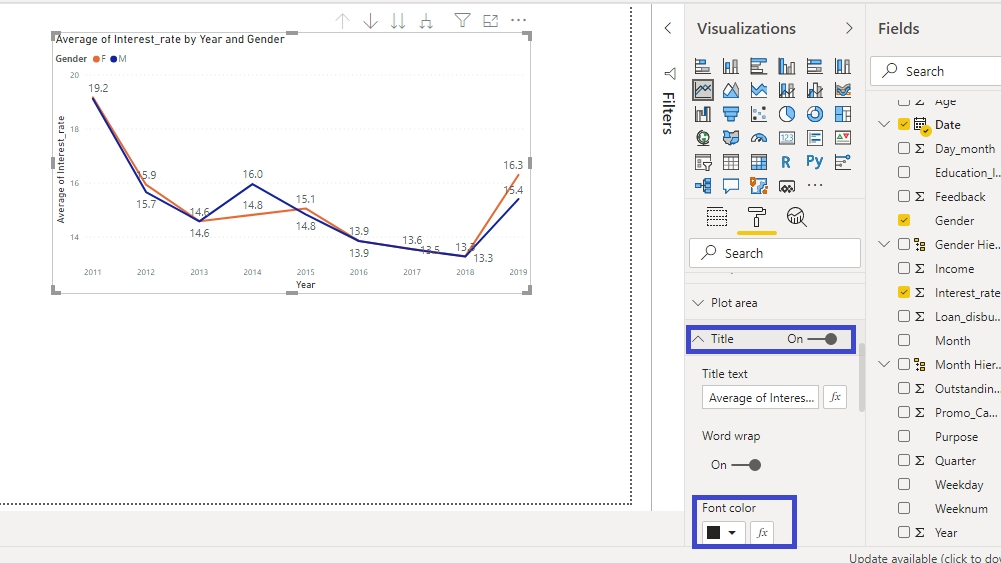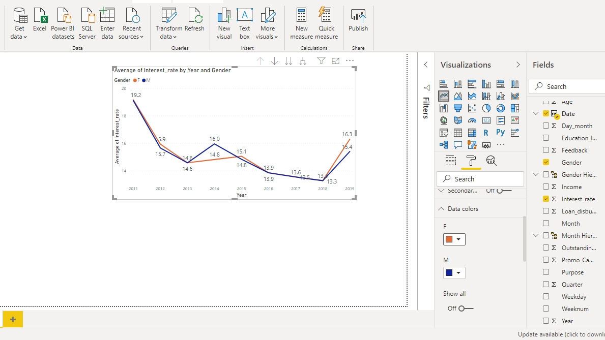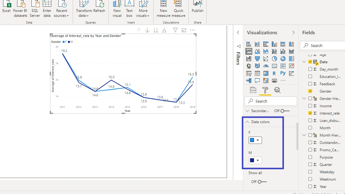 If you want to change the color of either of the line chart, that is also possible. Go to Data colors and you will see the default color for both gender.