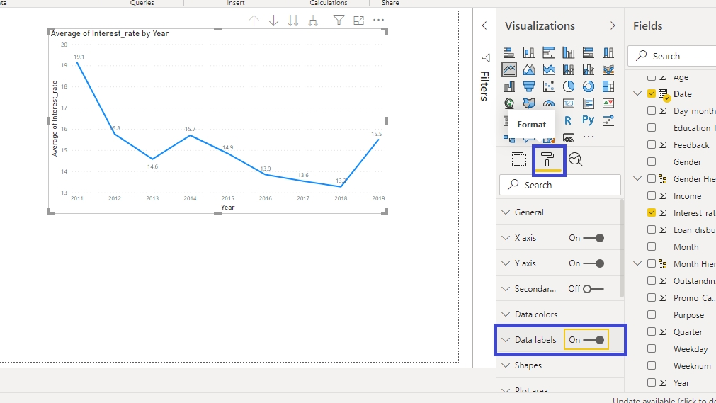 The Format field in Power BI Desktop provides several options to format the chart. To begin, turn on the Data labels as shown below.
