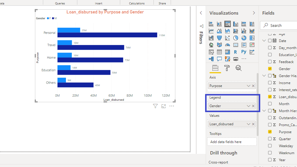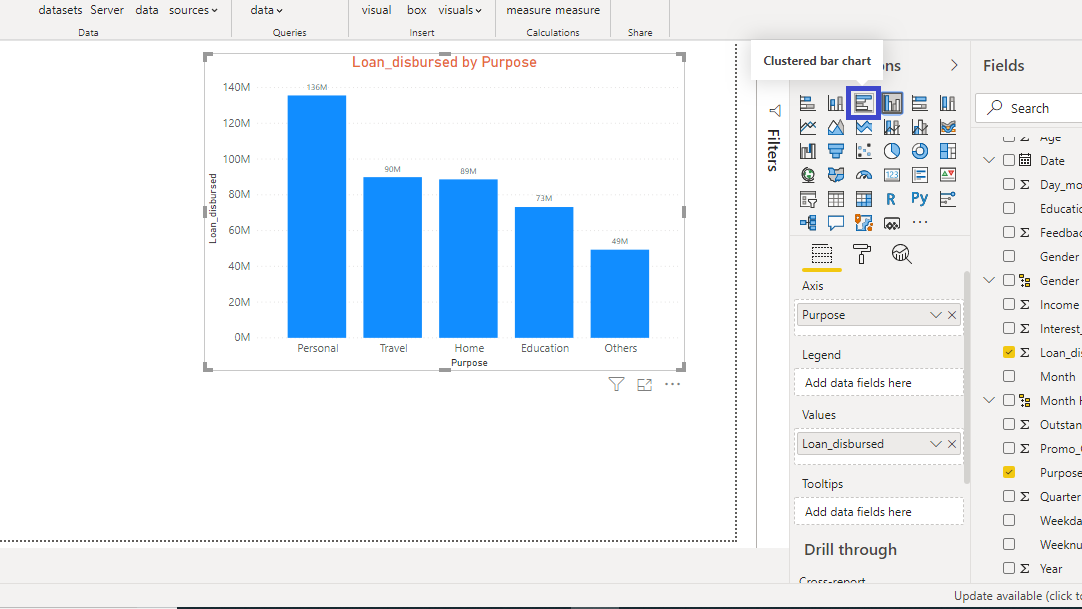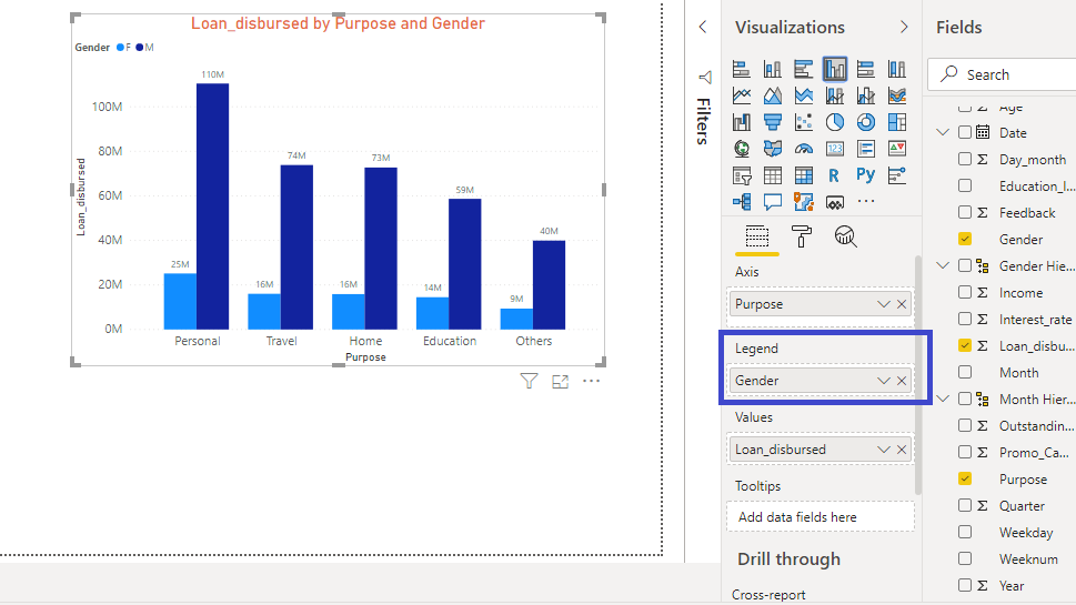 A clustered column charts is a type of column chart in which you compare two values side by side. In this case, you will compare the Loan_disbursed values against two categories, Purpose and Gender.