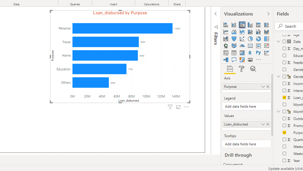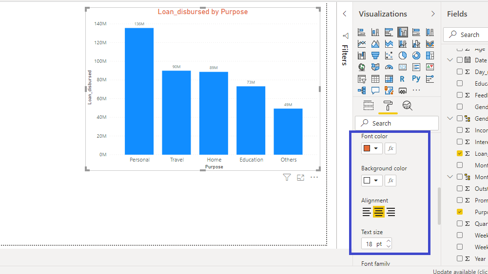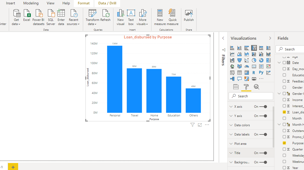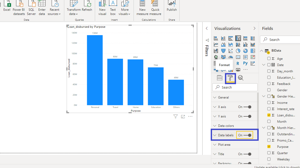 The output above shows the Loan_disbursed by Purpose chart. You can format the chart under the Format tab. For example, if you want to add values to the chart, turn on the Data labels.
