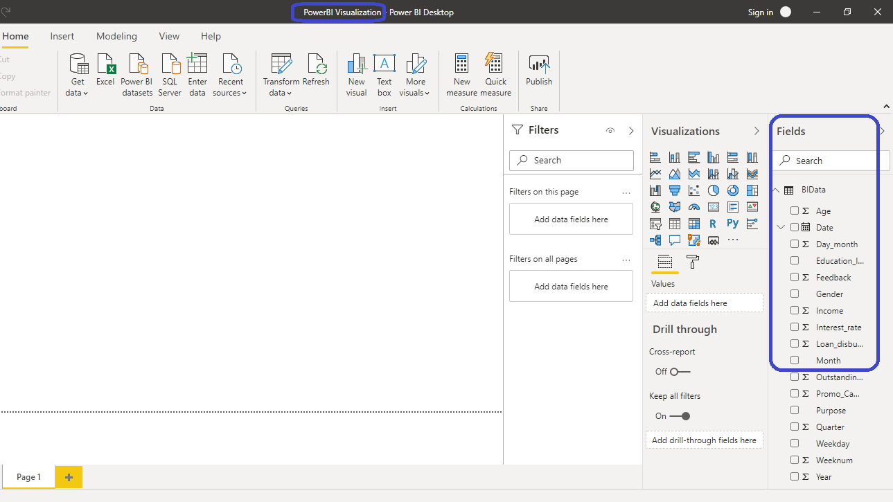 You have loaded the file, and you can save the dashboard. It is named PowerBI Visualization. The Fields pane contains the variables of the data.