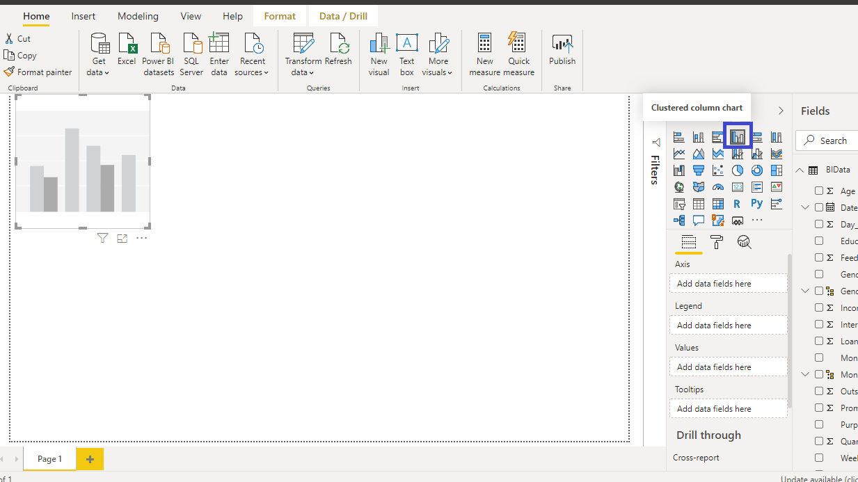 To begin, click on the Clustered column chart located in the Visualizations pane. This creates a chart box in the canvas. Nothing is displayed because haven't yet added the required visualization arguments.
