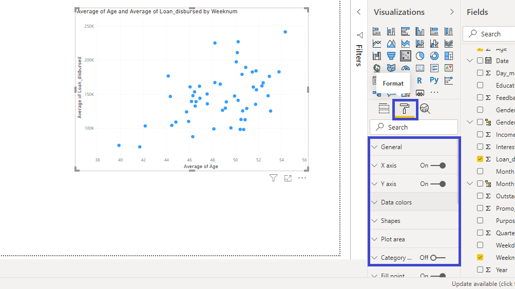 The output above shows the scatterplot of Age and Loan_disbursed by Weeknum. But there is a mistake in the chart. The variables Age and Loan_disbursed are getting added, instead of being an average. To make this correction, click on X Axis field and select Average.