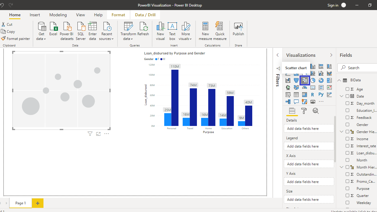 The output above shows that the chart now displays Loan_disbursed by Purpose and Gender, and has corresponding two colors for the Gender categories.