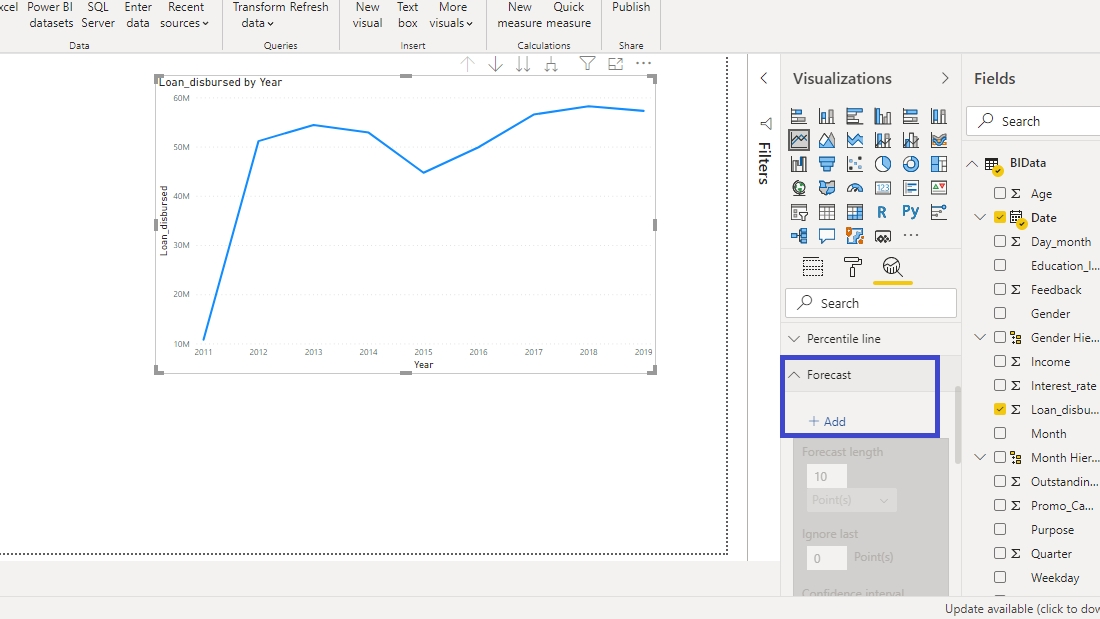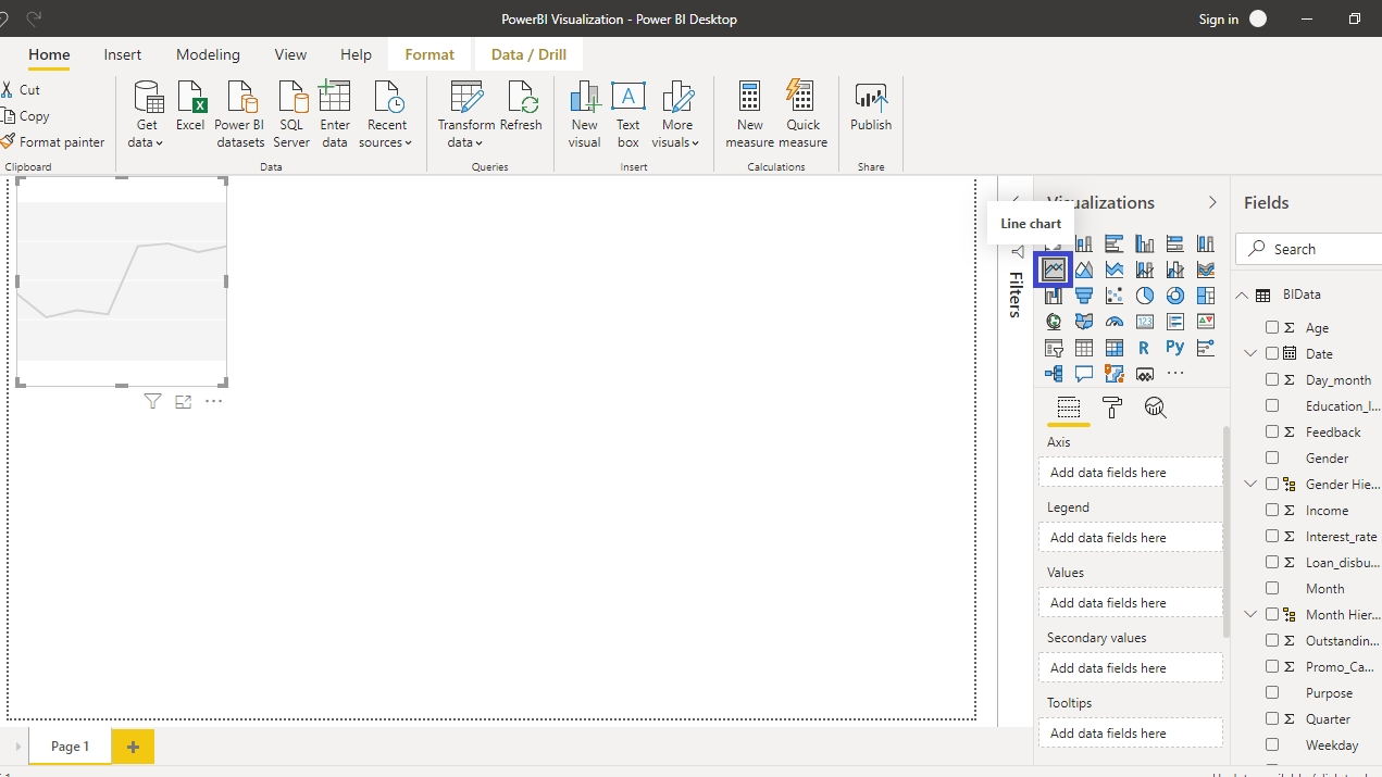 Time series forecasting is visually represented with a line chart. So, to begin, you will add a line chart to the canvas. You can locate it in the Visualizations pane. Click on the Line chart and it will create a chart box in the canvas. Nothing is displayed because you are yet to add the required visualization arguments.