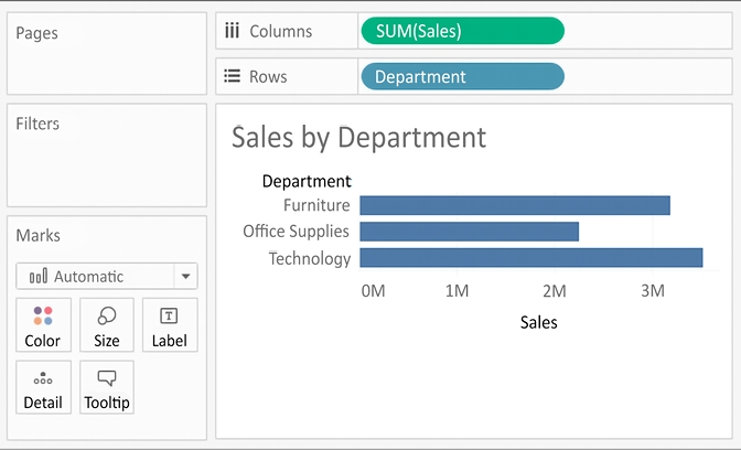 You now have a horizontal bar chart. This makes comparing the sales between the departments easy. The type drop-down menu on the Marks card is set to Automatic and indicates that Tableau has determined that bars are the best visualization given the fields you have placed in the view.