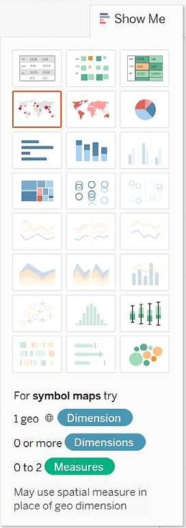 Show Me is a powerful component of Tableau that arranges selected and active fields into the places required for the selected visualization type. The Show Me toolbar displays small thumbnail images of different types of visualizations, allowing you to create visualizations with a single click. Based on the fields you select in the Data pane and the fields that are already in view, Show Me will enable possible visualizations and highlight a recommended visualization.