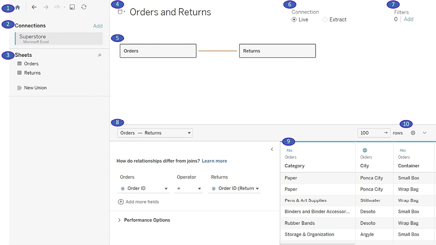 directory. Tableau will open the Data Source screen. You should see the two sheets of the Excel document listed on the left.Double-click the Orders sheet and then the Returns sheet. Tableau will prompt you with an Edit Relationship dialog. For now, accept the defaults by closing the dialog.
