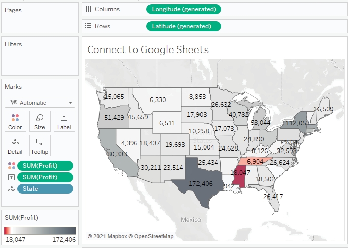 directory (selecting Yes to overwrite the existing file if needed). The data should be extracted within a few seconds.Create a filled map of Profit by State, with Profit defining the Color and Label: