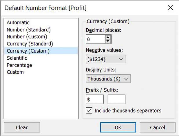 Decimal places and the Display Units in Thousands (K), before clicking OK: