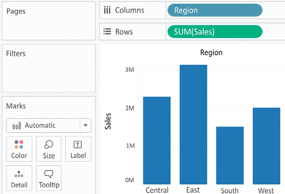 The view is defined by two fields. Region is the only dimension, which means it defines the level of detail in the view and slices the measure so that there will be a bar per region. Sales is used as a measure aggregated by summing each sale within each region. (Notice also that Region is discrete, resulting in column headers, while Sales is continuous, resulting in an axis.)