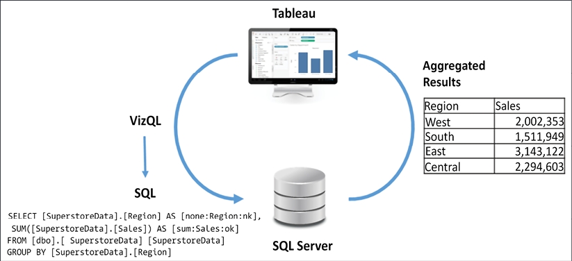 data stored in a table. When you first create the preceding screenshot, Tableau generates a VizQL script, which is translated into a SQL script and sent to the SQL Server. The SQL Server database engine evaluates the query and returns aggregated results to Tableau, which are then rendered visually.