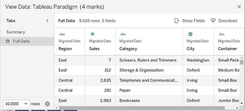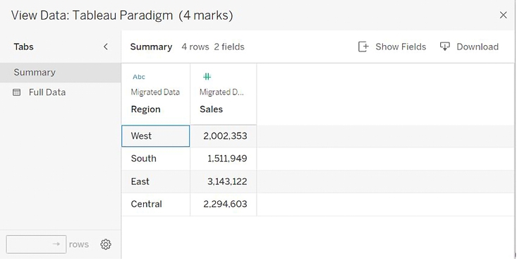 The View Data screen allows you to observe the data in the view. The Summary tab displays the aggregate-level data that was used to render the view. The Sales values here are the sum of sales for each region. When you click the Full Data tab, Tableau will query the data source to retrieve all the records that make up the aggregate records.