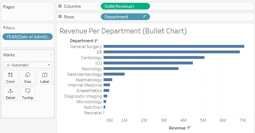 Create a basic bar chart of the total Revenue per Department. You can accomplish this by dragging Department to Rows and Revenue to Columns.