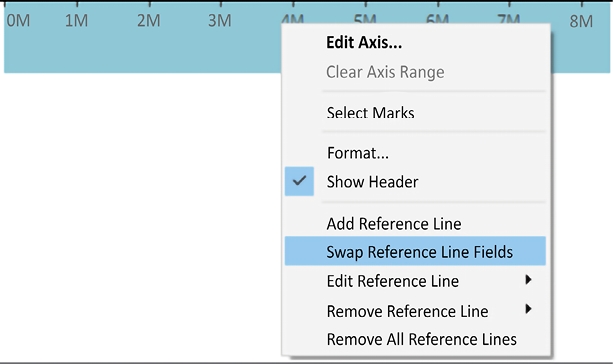 When you use Show Me to create a bullet chart, you may sometimes find that Tableau uses the fields in reverse order from what you intend (with the wrong measure defining the axis and bars, and the other defining the reference line). If this happens, simply right-click the axis and select Swap Reference Line Fields: