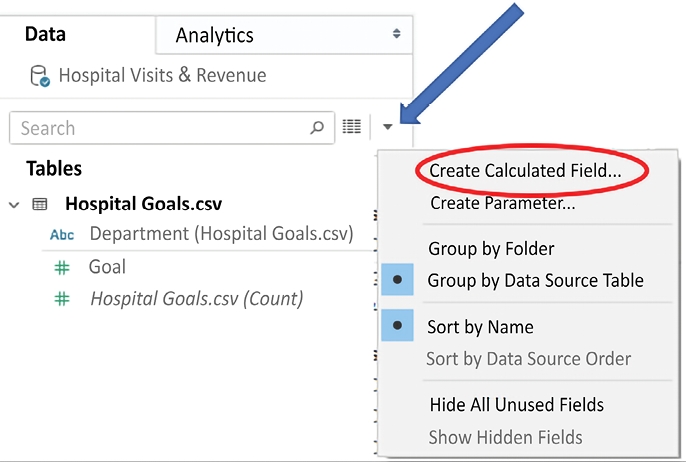 Use the drop-down arrow in the Data pane and select Create Calculated Field…: