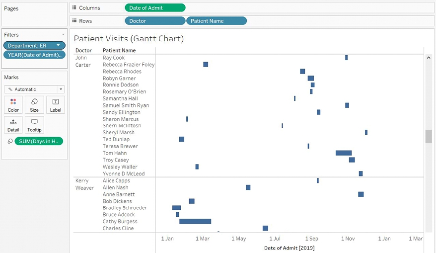 At the hospital, you might want to see each patient visit to the ER in 2019 and understand how long each visit lasted, whether any patients returned to the hospital, and how much time there was between visits. The following steps give an example of how you might create a Gantt chart:
