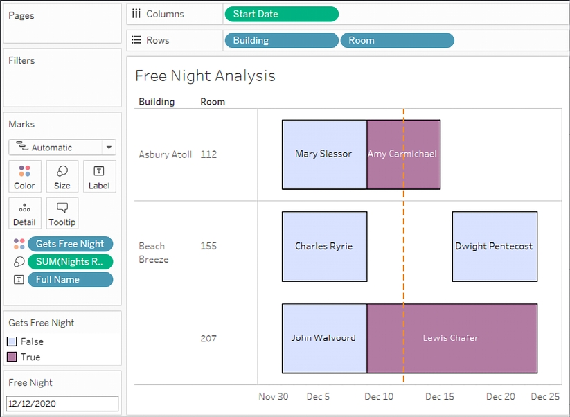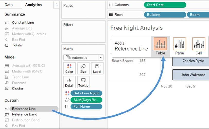 . This will allow the manager to set and adjust the starting date for the promotional month. Show the parameter control by selecting Show Parameter Control from the drop-down menu on the Free Night parameter in the data pane.Now, add a reference line to the view to show the free night. Do this by switching to the Analytics tab in the left-hand sidebar. Drag Reference Line to the view and drop it on Table: