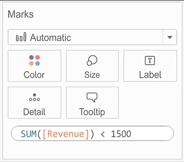 What if you wanted to quickly highlight any renters who had paid less than $1,500? One option would be to create an ad hoc calculation. To do so, simply double-click on an empty area of the Columns, Rows, or Measure Values cards, or on the empty space of the Marks shelf, and then start typing the code for a calculation. In this example, we’ve double-clicked the empty space on the Marks shelf: