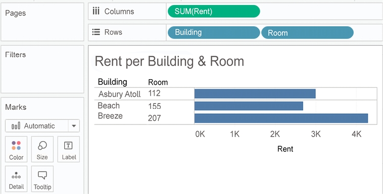 Using the two calculated fields, create a bar chart of Rent per Building & Room, like this: