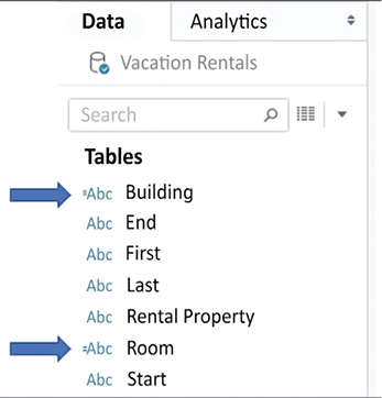 The Building and Room fields show up in the data pane as dimensions. The calculated dimensions can be used just like any other dimension. They can slice the data, define the level of detail, and group measures.